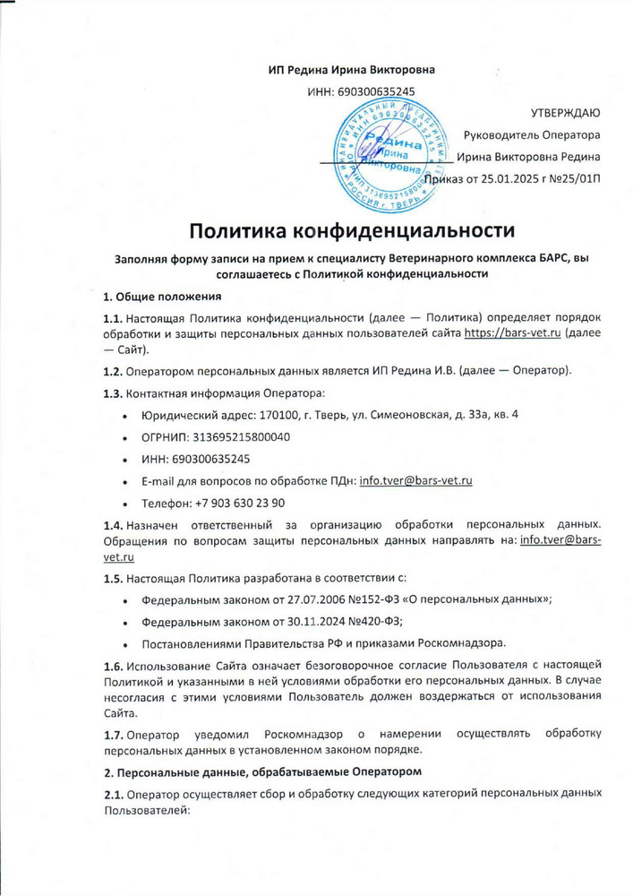 Настоящим я свободно, своей волей и в своем интересе, а также подтверждая свою дееспособность, выражаю согласие в соответствии с Федеральным законом от 27.07.2006 № 152-ФЗ «О персональных данных», Федеральным законом от 30.11.2024 № 420-ФЗ Ветеринарному комплексу БАРС в лице Индивидуального предпринимателя Рединой Ирины Викторовны (ИНН 690300635245, ОГРНИП 313695215800040, юридический адрес 170100, г. Тверь, ул. Симеоновская, д. 33а, кв. 4), далее — Оператор, на обработку моих персональных данных на сайте, расположенном по адресу https://bars-vet.ru, в соответствии со следующими условиями: