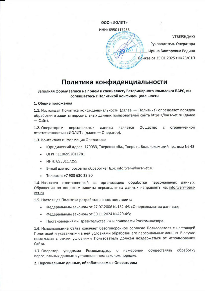 Настоящим я свободно, своей волей и в своем интересе, а также подтверждая свою дееспособность, выражаю согласие в соответствии с Федеральным законом от 27.07.2006 № 152-ФЗ «О персональных данных», Федеральным законом от 30.11.2024 № 420-ФЗ Ветеринарному комплексу БАРС в лице ООО «ИОЛИТ» (ИНН 6950117255, ОГРН 1106952011781, юридический адрес: 170033, Тверская обл., Тверь г., Волоколамский пр., дом № 43), далее — Оператор, на обработку моих персональных данных на сайте, расположенном по адресу https://bars-vet.ru, в соответствии со следующими условиями: