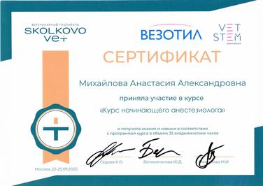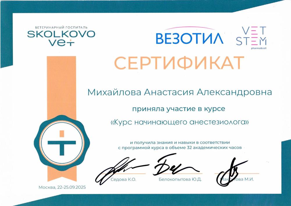 В 2025 г. прошла "Курс начинающего анестезиолога" в Ветеринарном госпитале "Сколково Вет"