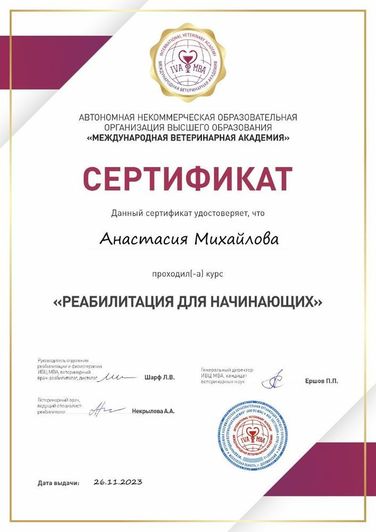 В 2023 г. прошла курс "Реабилитация для начинающих" в Международной ветеринарной академии.