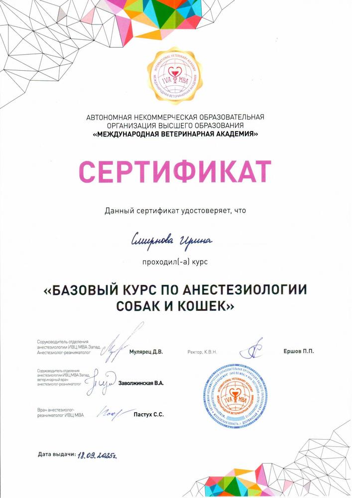 в 2025 г. прошла курс повышения квалификации по специальности "Базовый курс по анестезиологии собак и кошек"