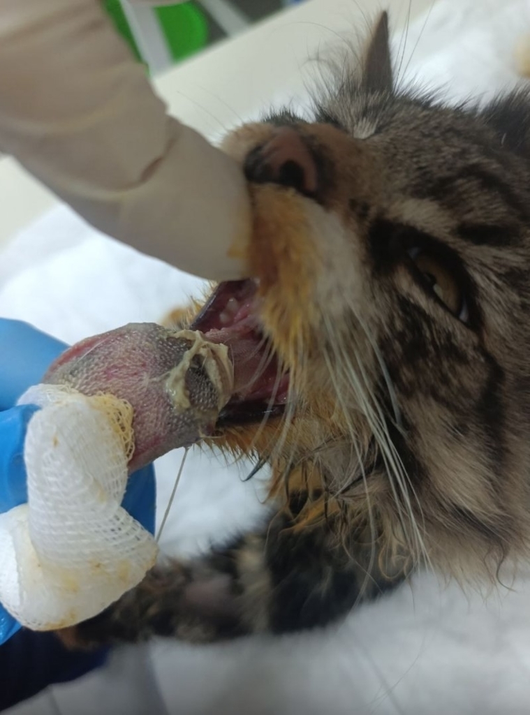 Даже если кошка или собака не проглотят инородное тело, оно может травмировать ротовую полость, например, зацепившись за язык, как это произошло с одной из наших пациенток. В такой ситуации помощь нужная незамедлительно, т.к. перетянувшая язык резинка не только вызывает дискомформ и не дает кошке есть и пить, но приводит к быстро развивающемуся отеку тканей и далее - к некрозу.