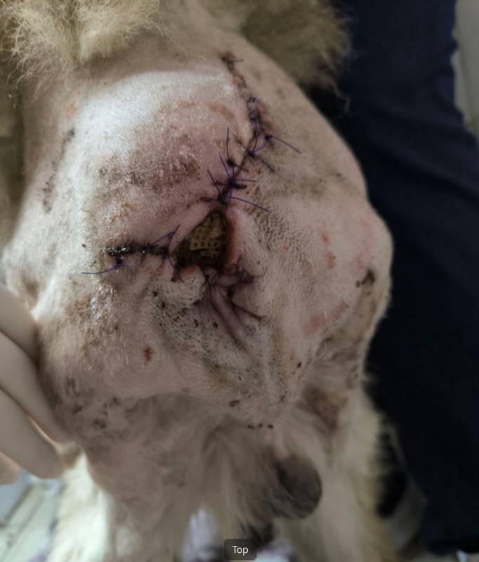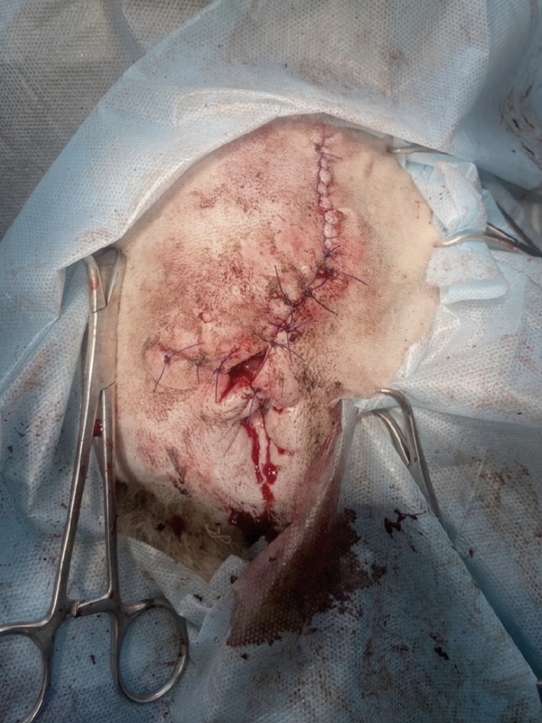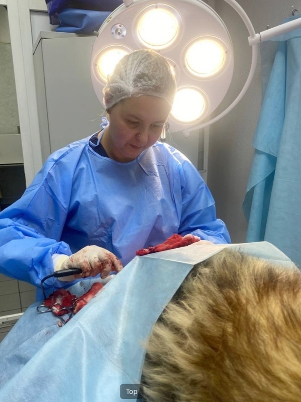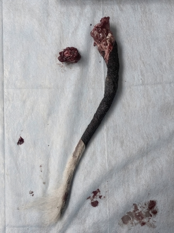 Через два дня после поступления в Клинику Тора прооперировала Анна Сергеевна Кашина. Хвост был ампутирован, некротизированные ткани удалены. Из-за обширности поражения тканей и из-за того, что место ампутации было длительно инфицировано, было принято решение не закрывать дефект полностью, чтобы иметь возможность проводить обработки. В галерее показан процесс регенерации, который шел медленно, но все же успешно. Главной опасностью было повторное инфицирование открытой раны, но, к счастью, в условиях стационара этого удалось избежать.