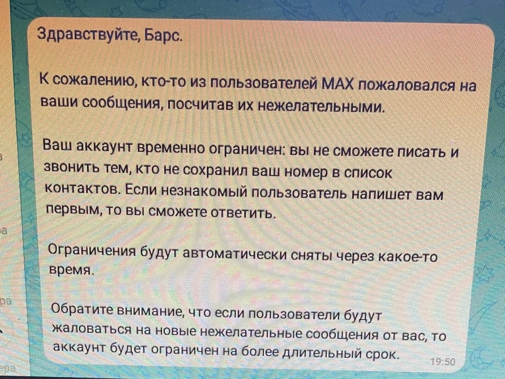 В течение нескольких лет для рассылки уведомлений о записи мы пользовались WhatsApp*, который в настоящее время практически не работает. МАХ - единственный мессенджер, который позволяет интегрировать себя в нашу программу записи в клинику, потому с 2026 г. мы стали использовать его. Однако через несколько дней после начала рассылки мы получили вот такое уведомление (фото). Сожалеем, если кого-то мы побеспокоили напоминанием о визите к врачу с питомцем. Но если такие "жалобы" будут повторяться, МАХ заблокирует рассылку от БАРСа, и мы не сможем отправлять вам сообщения. Вряд ли это будет удобно для большинства наших клиентов.