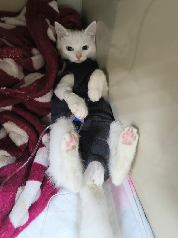 Фото 1 - рыжий котик в ожидании кастрации (он не под наркозом, как вы могли подумать). Фото 2 - белая кошечка после операции получает инфузионную терапию.