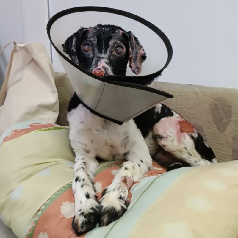 💬 Ирис (тогда ее еще звали Маней) привезли к нам в клинику из Ржева после пожара в каком-то сарае, где из всех животных смогли спасти только ее. Привезли волонтеры, потому что хозяйка не могла, да и потом достаточно быстро она от нее отказалась. Поэтому вопрос дальнейшей судьбы пострадавшей собаки был очень неопределенный.