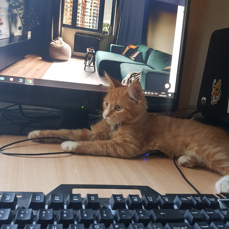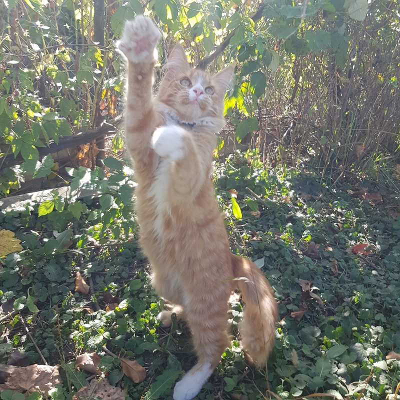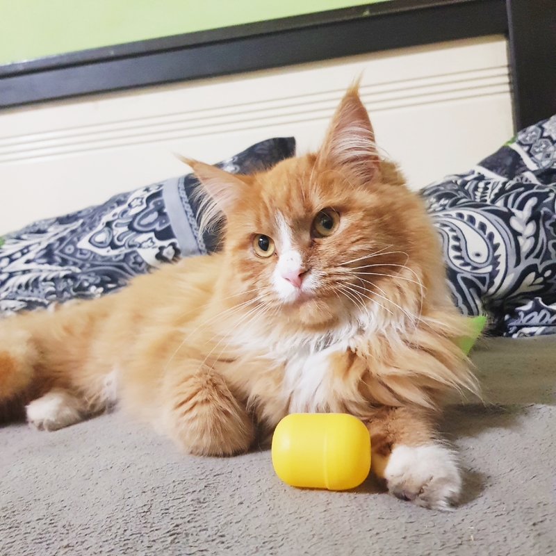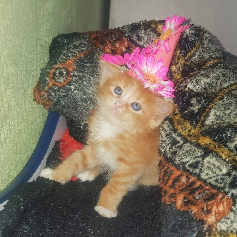 Естественно, в магазин я уже не пошла, а понесла домой котенка. Принесла, отогрела, высушила, а эта малышка оказалась неописуемо красива! Рыжая, и, как потом мы поняли, она - метис мей-куна. Назвали мы её Соней, потому что, когда была маленькая, она очень много спала. А как Соне исполнилось 7 месяцев, мы ее стерилизовали.