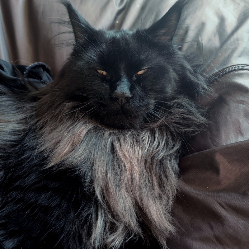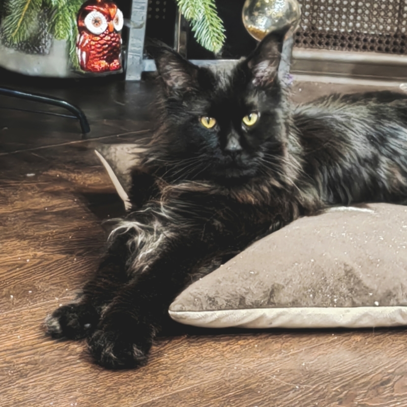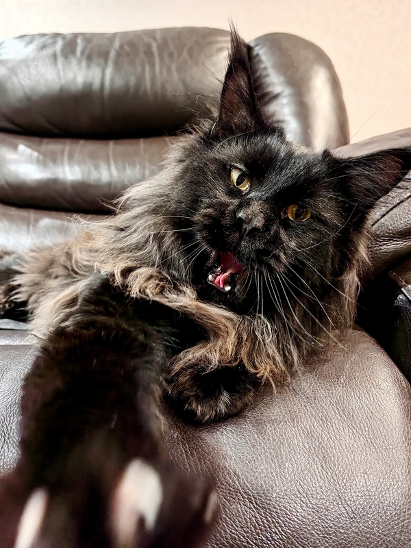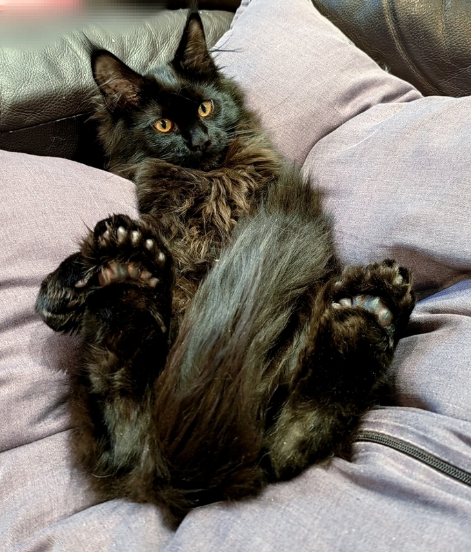 Второго, черного, вы видите реже (наверное, к счастью ). Это полидакт мейн-кун Ёкарный бабай (да, да, так и записано в родословной). Очень важный, очень умный кот. Всегда рядом - проверяет порядок)) Считает себя хозяином нас и всей квартиры. Но Балуша периодически ставит его на место))
